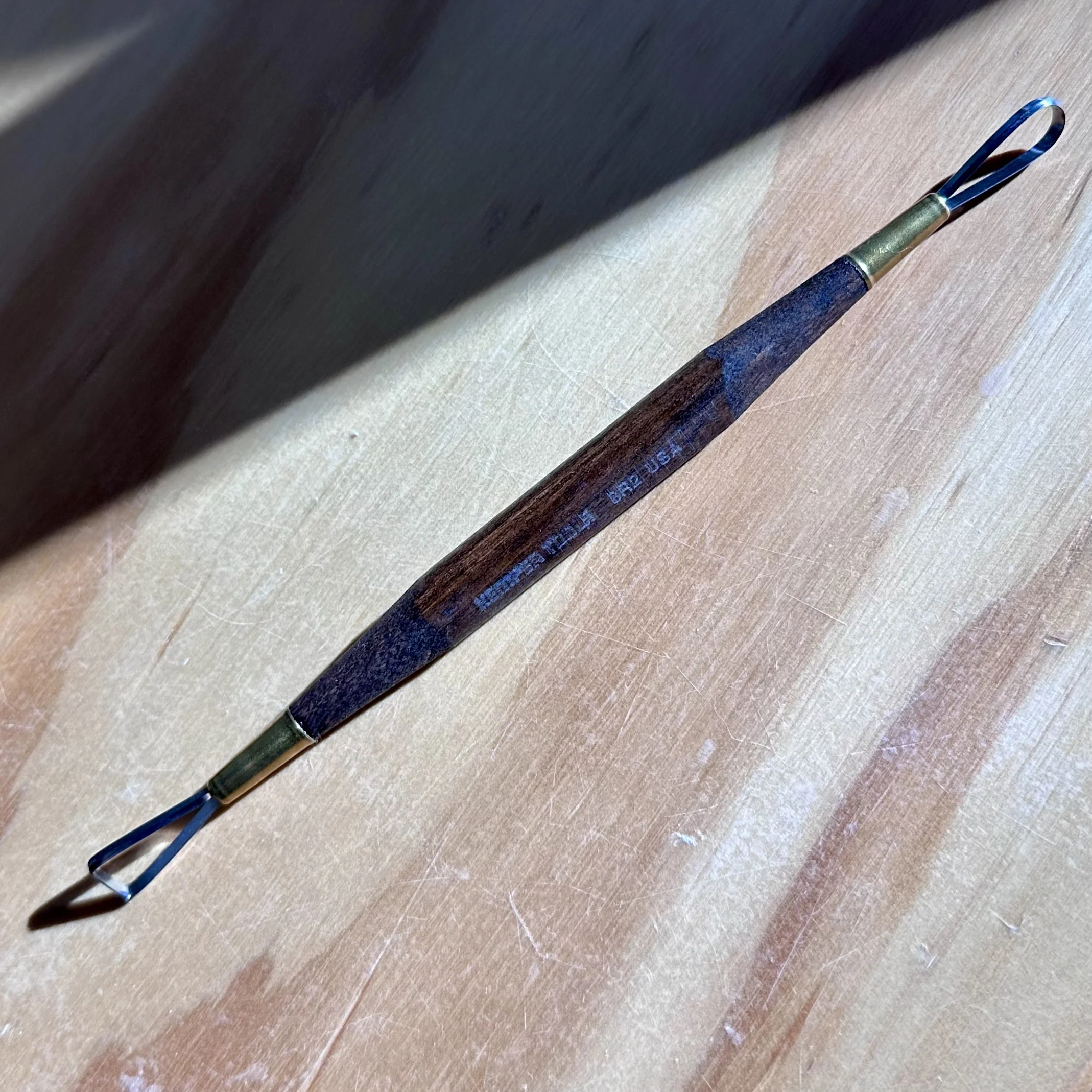 This 8″ double-ended ribbon tool is used for light cutting, slicing, and shaping. The ends are formed from high-carbon heat-treated steel and are firmly attached to hardwood handles.